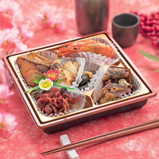 たら甘露煮、ぶり照り焼き、えび煮、いいだこ煮、さけ昆布巻、さわら西京焼